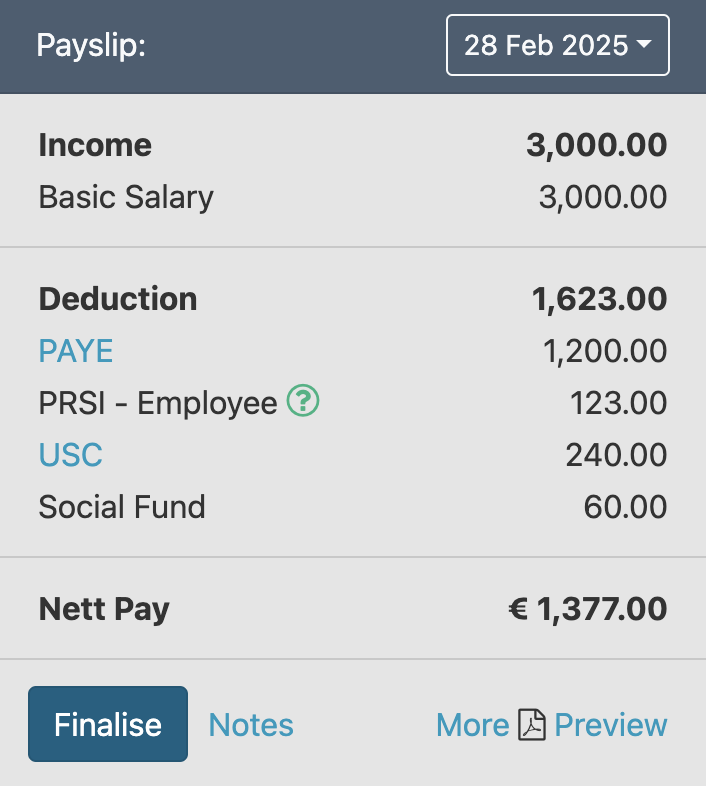 SimplePay automatically calculates statutory deductions for PAYE, USC, and PRSI, and you will see these in the Payslip block, along with all of the other items you added above. When viewing the information in the Payslip block, you have the following options: